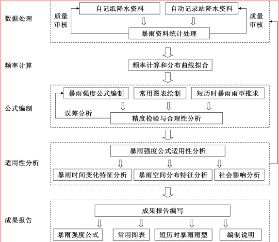 呼和浩特市暴雨強(qiáng)度公式編制的主要內(nèi)容包括資料處理、單一重現(xiàn)期暴雨強(qiáng)度公式擬合、區(qū)間參數(shù)公式擬合、暴雨強(qiáng)度總公式擬合、常用查算圖表編制、精度檢驗、各強(qiáng)度暴雨時間變化特征和暴雨強(qiáng)度空間分布特征分析等內(nèi)容,具體流程如下: