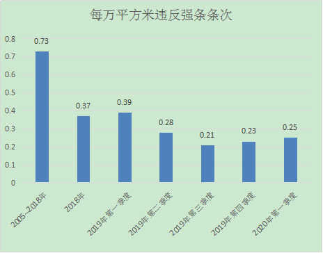 2020年第一季度我中心施工圖審查總建筑面積為205萬(wàn)㎡,共審查出違反強(qiáng)制性條文51條,每萬(wàn)平米違反強(qiáng)條0.25條次,與往年對(duì)比分析如下: