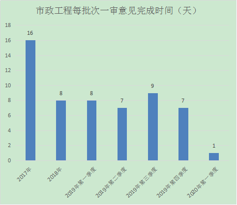 2020年第一季度我中心市政工程項(xiàng)目共審查1項(xiàng),一次性審查通過(guò)0項(xiàng),一次性審查通過(guò)率為0%;每批次一審意見(jiàn)完成時(shí)間為1天,與往年對(duì)比分析如下: