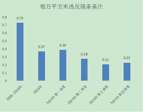 2019年第四季度我中心施工圖審查總建筑面積為278萬(wàn)㎡,共審查出違反強(qiáng)制性條文64條,每萬(wàn)平米違反強(qiáng)條0.23條次,與往年對(duì)比分析如下: